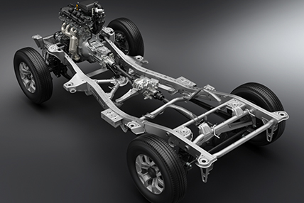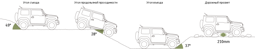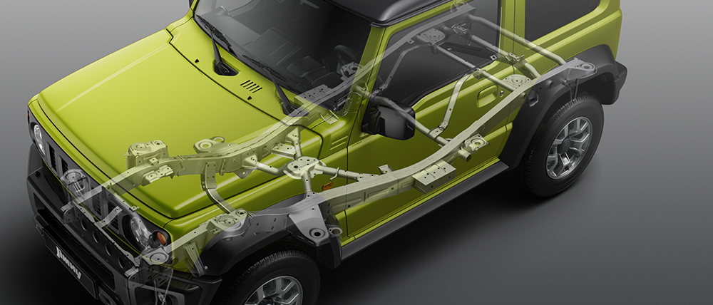 Jimny остаётся настоящим бескомпромиссным внедорожником благодаря четырём конструктивным особенностям: прочной лонжеронной раме, превосходной геометрической проходимости, неразрезным мостам спереди и сзади, а также системе полного привода с понижающей передачей.